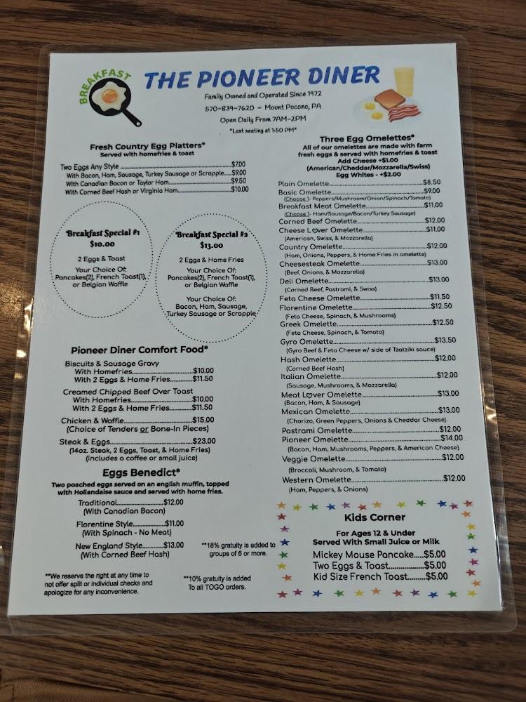 Welcome to Pioneer Diner, your go-to spot for delightful meals in Mt Pocono! Located at 508 Pocono Blvd, our cozy diner specializes in hearty breakfasts, satisfying lunches, and delicious dinners, all made with locally sourced ingredients. Enjoy our excellent coffee and mouthwatering desserts in a relaxed atmosphere, perfect for solo diners or groups alike. We cater to various dietary preferences, including vegetarian options, and offer takeout, delivery, and on-site dining. With accessible facilities and a welcoming ambiance, Pioneer Diner is the ideal choice for a tasty meal any time of day. Join us for a memorable experience!